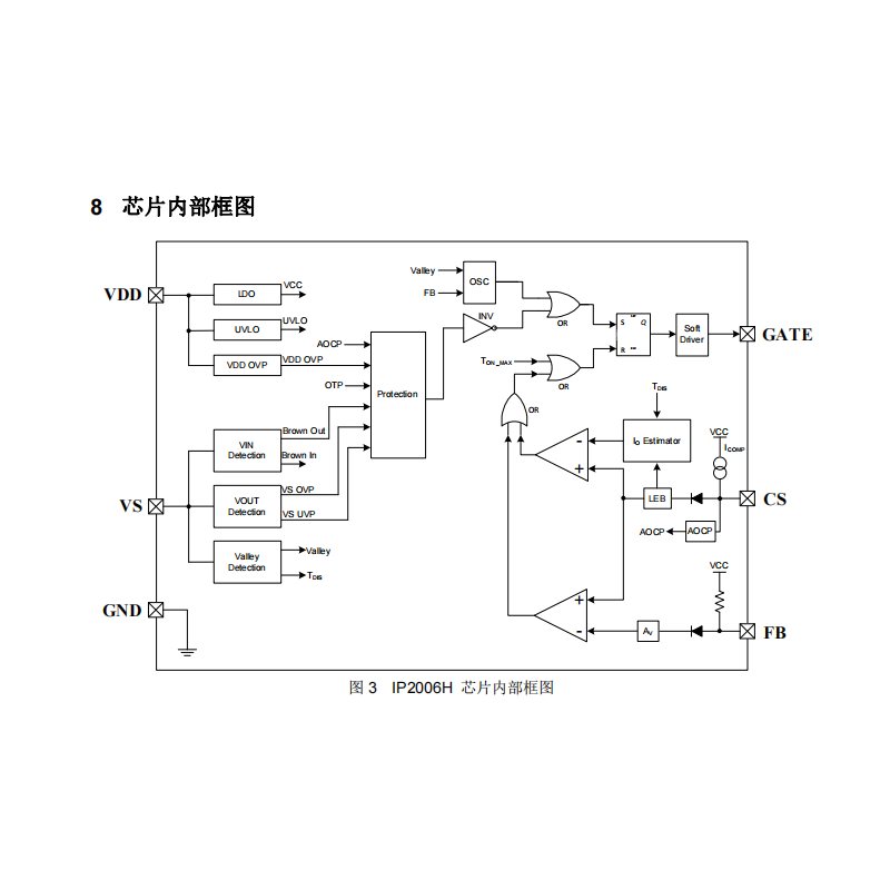 IP2006H具备较为全面的保护功能,包括Brown-in/Brown-out(输入欠压/过压保护)、输出过压保护、输出欠压保护、VDD过压保护、输入过压保护及过热保护等。芯片还支持过功率保护,可在输出功率超过设定值时自动限流,防止设备因过载受损。这些保护功能有助于系统在异常情况下仍保持安全运行,提升产品可靠性与使用寿命。