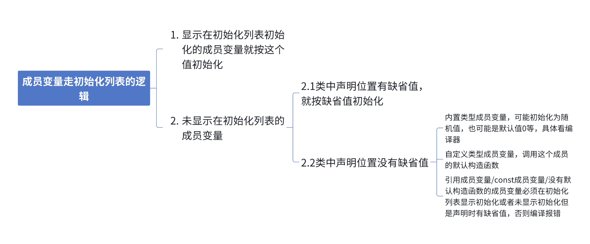 • 尽量使用初始化列表初始化,因为那些你不在初始化列表初始化的成员也会走初始化列表,如果这个成员在声明位置给了缺省值,初始化列表会用这个缺省值初始化。如果你没有给缺省值,对于没有显示在初始化列表初始化的内置类型成员是否初始化取决于编译器,C++并没有规定。对于没有显示在初始化列表初始化的自定义类型成员会调用这个成员类型的默认构造函数,如果没有默认构造会编译错误。