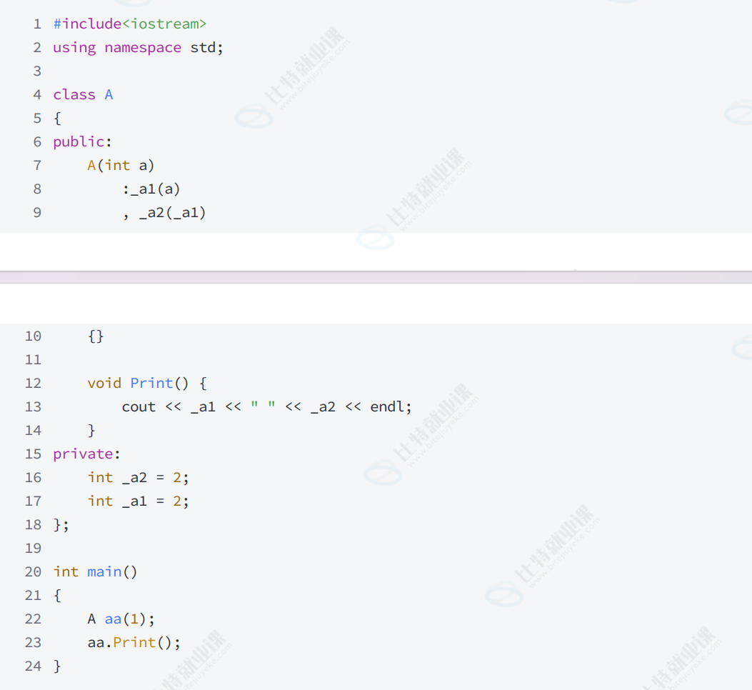 • 初始化列表中按照成员变量在类中声明顺序进行初始化,跟成员在初始化列表出现的的先后顺序无关。建议声明顺序和初始化列表顺序保持一致。