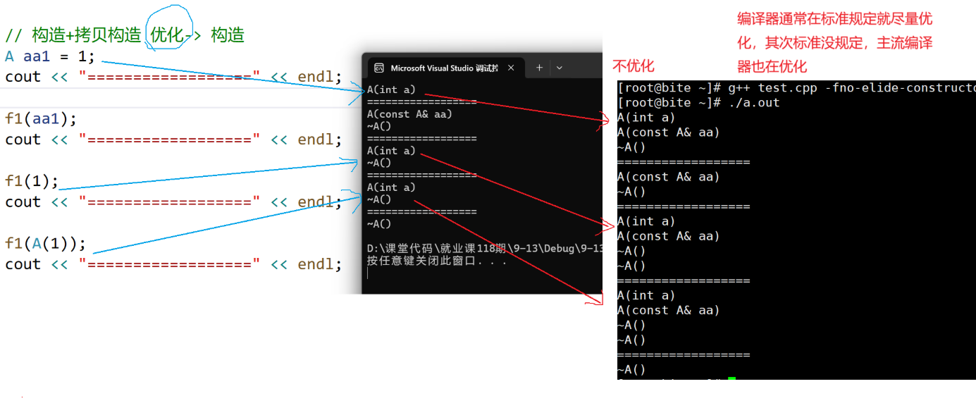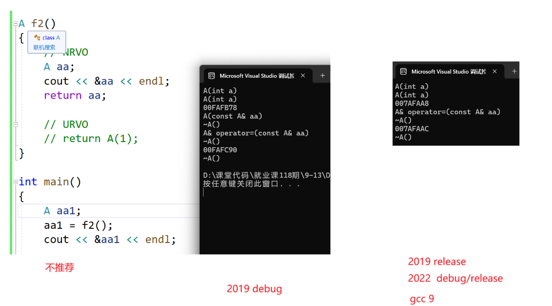 • 现代编译器会为了尽可能提高程序的效率,在不影响正确性的情况下会尽可能减少一些传参和传返回值的过程中可以省略的拷贝。