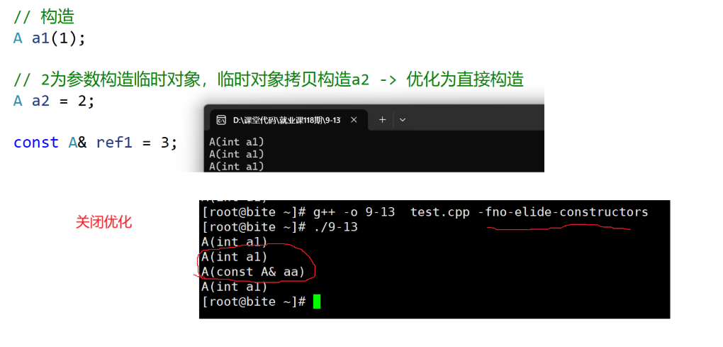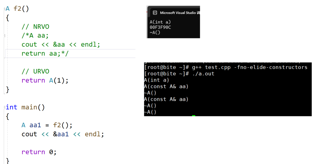 • linux下可以将下面代码拷贝到test.cpp文件,编译时用 g++ test.cpp -fno-elide-constructors 的方式关闭构造相关的优化。