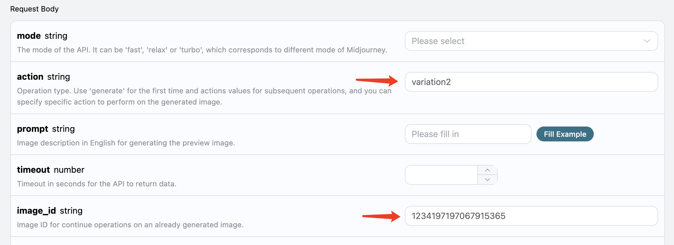 下面我们尝试针对当前生成的照片进行进一步的操作,比如我们觉得右上角第二张的图片还不错,但我们想进行一些变换微调,那么就可以进一步将 action 填写为 variation2,同时将 image_id 传递即可: