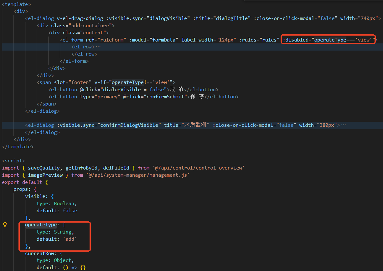 1)给el-form设置disabled属性,disabled属性值根据操作类型(新增、编辑、查看)operateType==='view'控制;