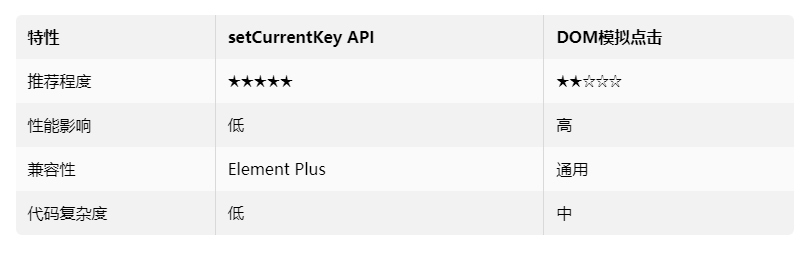 setCurrentKey是Element Plus提供的官方API,通过设置当前节点的key值实现选中效果。该方法需要配合highlight-current属性和node-key使用。