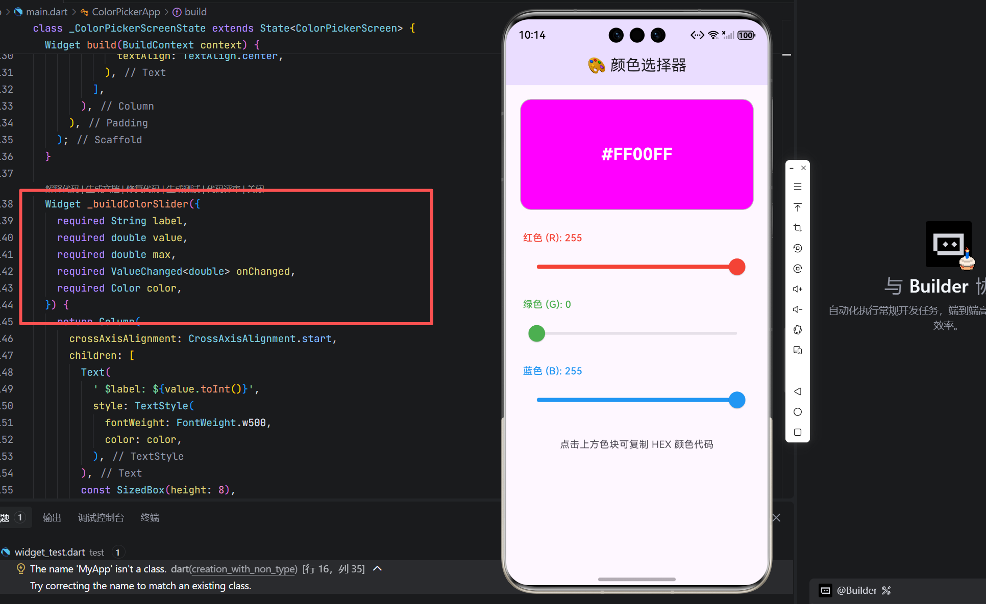 这个颜色选择器仅有约 130 行代码,却完整体现了 现代 Flutter 开发的核心理念: