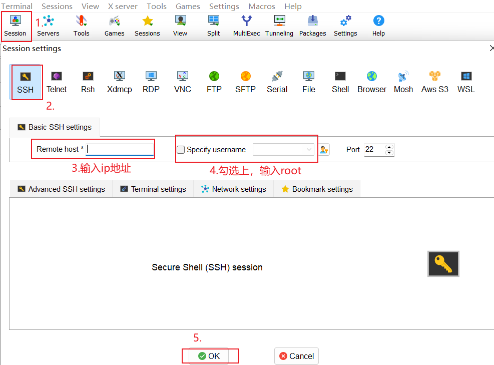 - 打开MobaXterm,点击Session,点击SSH,输入Ip4,勾选Specify username,输入root,点击OK