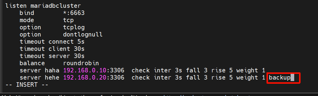 server hehe 192.168.0.20:3306 check inter 3s fall 3 rise 5 weight 1 backup