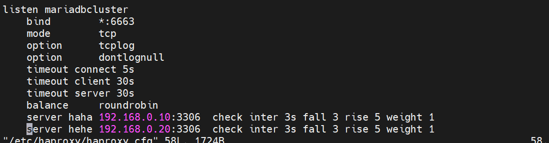 server hehe 192.168.0.20:3306 check inter 3s fall 3 rise 5 weight 1