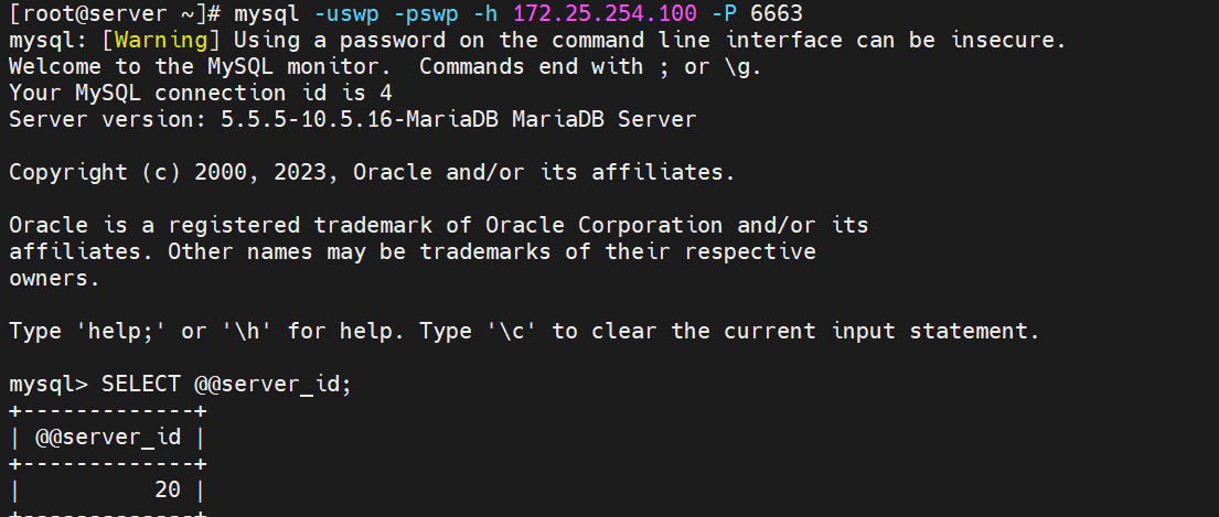 [Administrator.DESKTOP-VJ307M3] ➤ mysql -uswp -pswp -h172.25.254.100 -P 6663