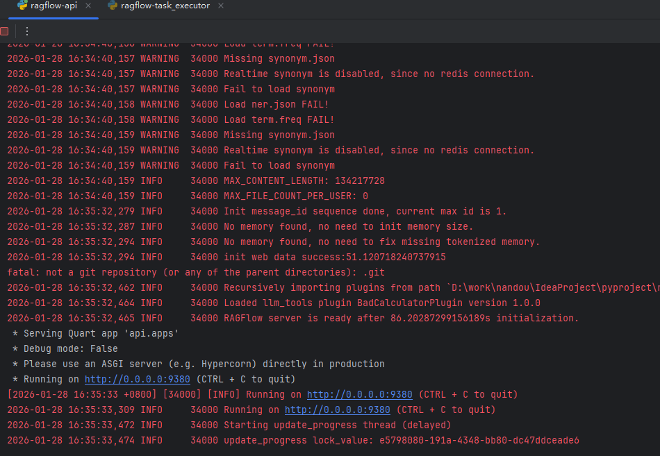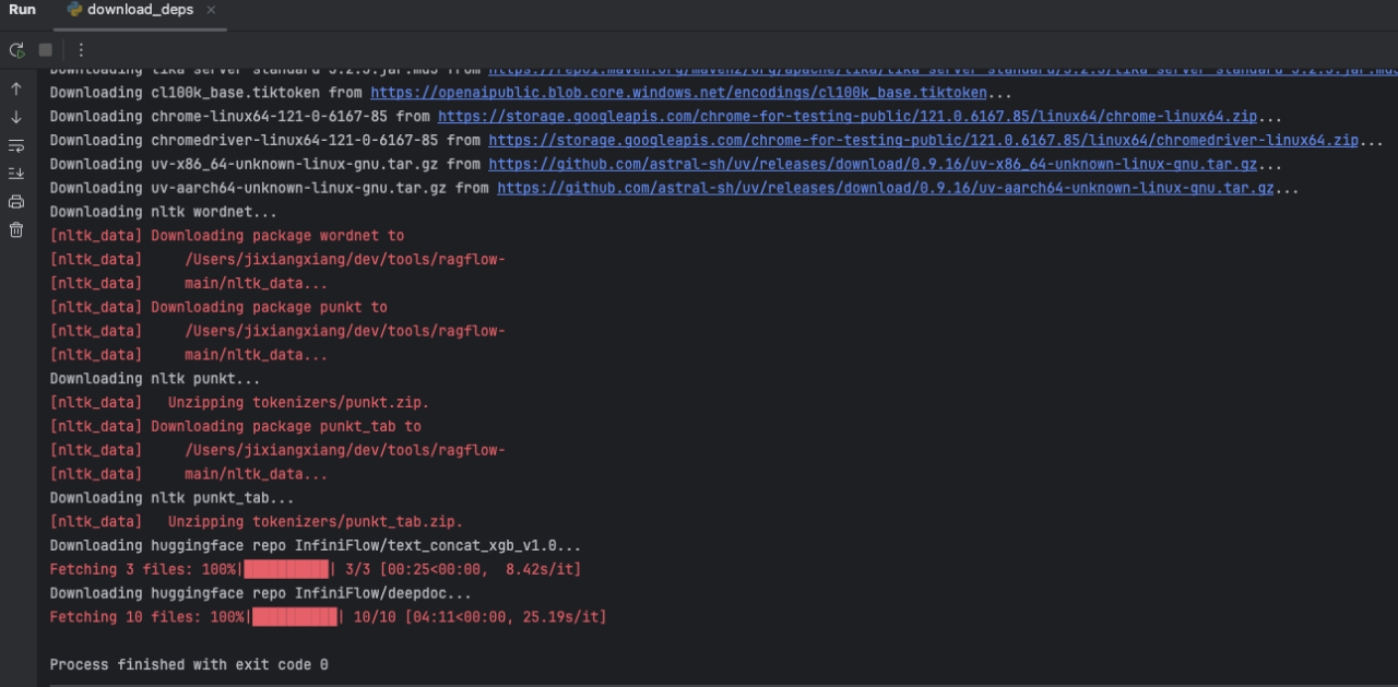 启动ragflow要先下载一些模型文件模型文件,可直接执行download_deps.py,此处需要科学上网,等待是来分钟。