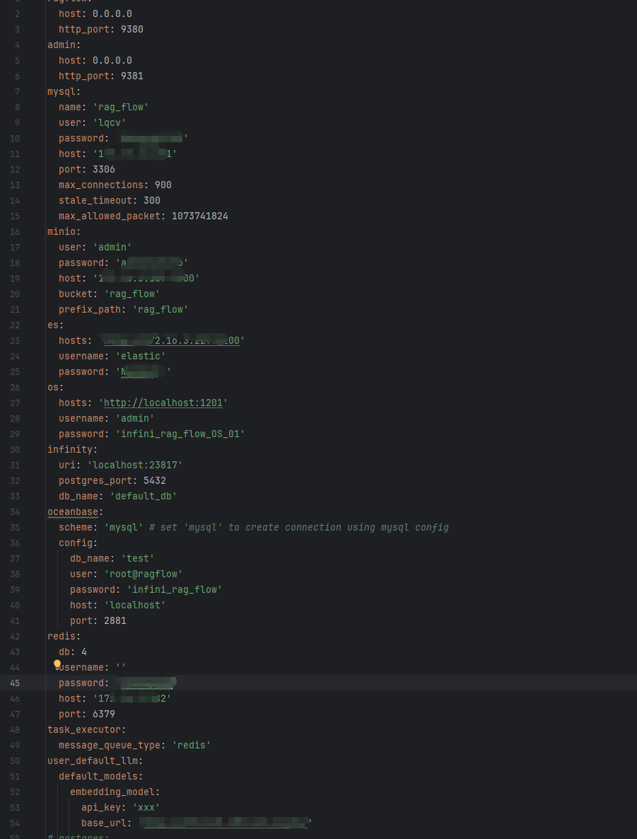 进入conf目录,打开service_conf.yaml文件,将配置改成实际依赖的环境,主要修改mysql、minio、es(必须是8以上)和redis(redis必须是5以上)