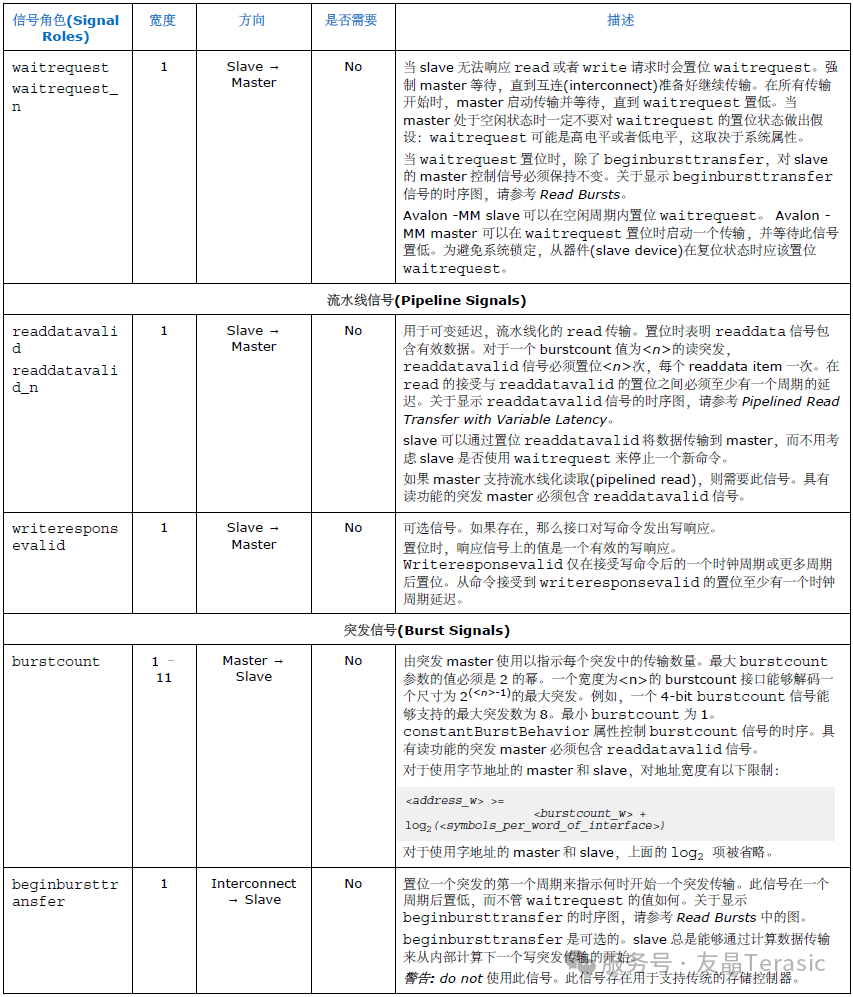 Avalon® Interface Specifications文档的 Table 9列出了Avalon-MM接口的信号。。注意:Avalon规范不要求所有信号都存在于一个Avalon-MM接口中,即当一个接口为Avalon-MM接口时,只包含所需要的某些信号即可。例如,对于只支持读操作(read-only)的接口,最少可只包含readdata信号;对于只支持写操作(write-only)的接口,最少可只有writedata和wrtie信号。