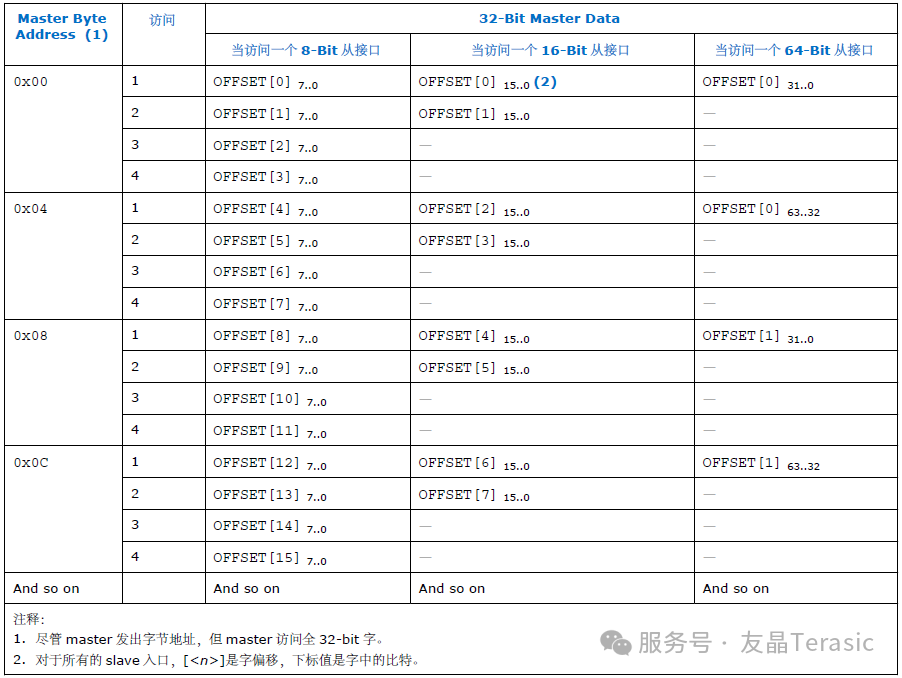 Slave的数据宽度必须是8、16、32、64、128、256、512 或者1024位。下表列出了32位的master按字访问不同位宽的slave数据时是如何与master对齐的,OFFSET[N]表示slave地址空间字的偏移量。