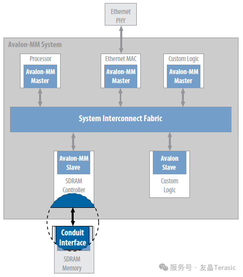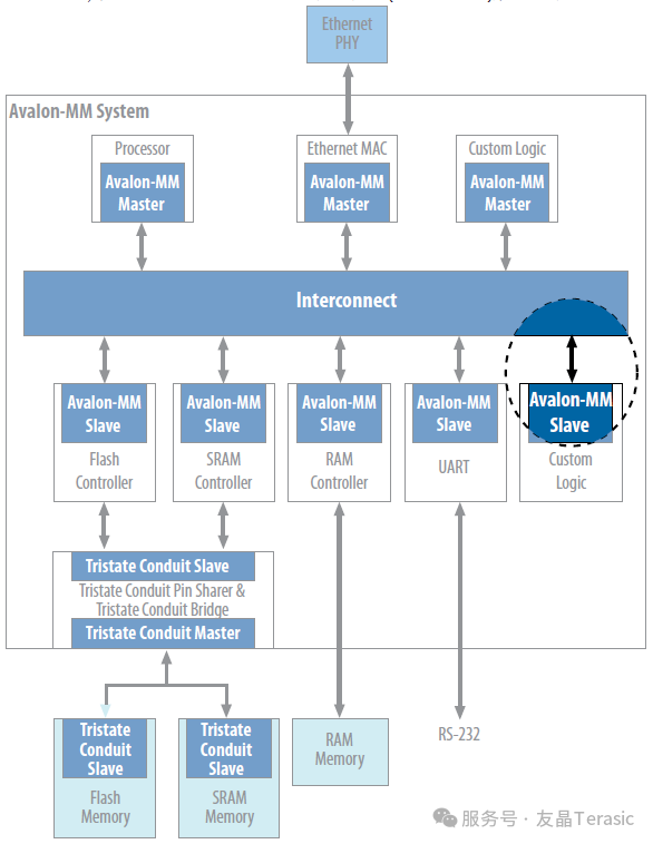 Avalon Tri-State Conduit Interface (Avalon-TC), Avalon 三态Conduit接口 -- 与片外设备的接口。多个外设可以通过信号的多路复用共享引脚,从而减少FPGA引脚数和PCB走线数。