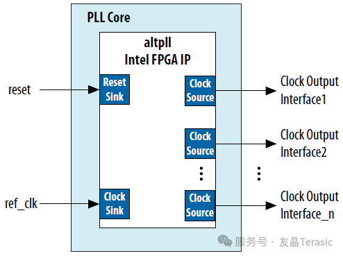 Avalon时钟接口定义了组件使用的时钟,一个组件可以有时钟输入、时钟输出或时钟输入输出都含有。例如,锁相环(PLL)是一个包含了时钟输入和时钟输出的组件,如图所示。