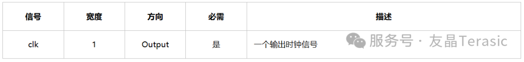 Clock source接口从一个组件中输出一个时钟信号。clock source有三个属性,associatedDirectClock表示直接驱动该时钟的时钟名称,clockRate表示时钟输出的频率,clockRateKnown指示时钟频率是否已知。
