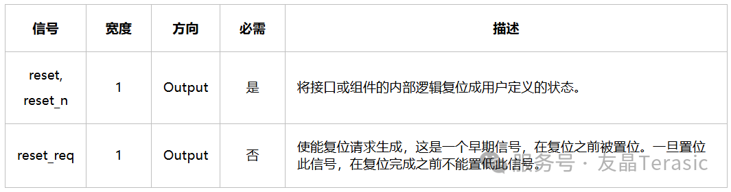 Reset sink包含两个信号,reset/reset_n和reset_req,reset_req是一个可选的信号。Reset sink有两个属性,associatedClock表示与该接口同步的时钟,synchronous-Edges表示复位所需要的同步类型,NONE表示不需要同步,DEASSERT表示复位是异步的,取消复位是同步的,BOTH表示复位和取消复位都是同步的。