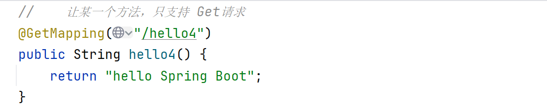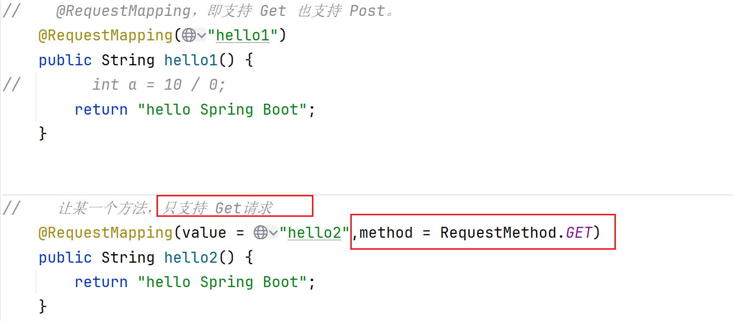 @RequestMapping(value = "hello2",method = RequestMethod.GET) 和 @GetMapping("/hello4") ,让 hello2 和 hello4 这两个方法,仅支持 Get请求。