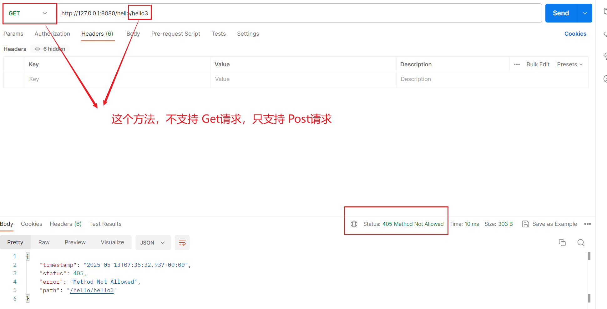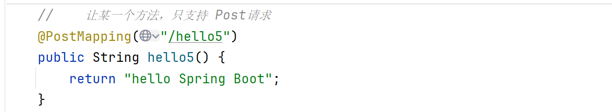@RequestMapping(value = "hello3",method = RequestMethod.POST) 和 @PostMapping("/hello5"),让 hello3 和 hello5 这个方法,只能支持 Post请求。