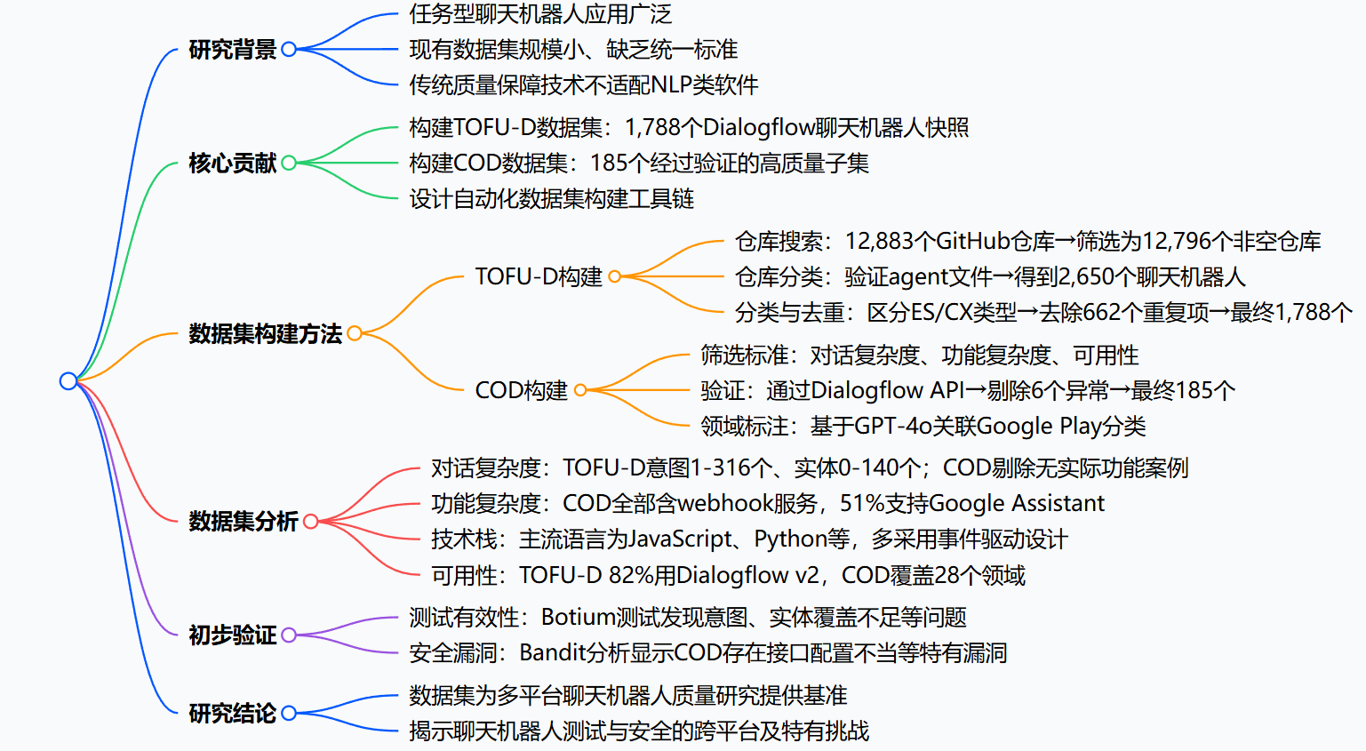 - 填补商业平台数据集空白:首次针对谷歌商业平台Dialogflow,构建了大规模快照数据集TOFU-D和高质量精选数据集COD,弥补了以往研究集中于开源平台的缺陷。