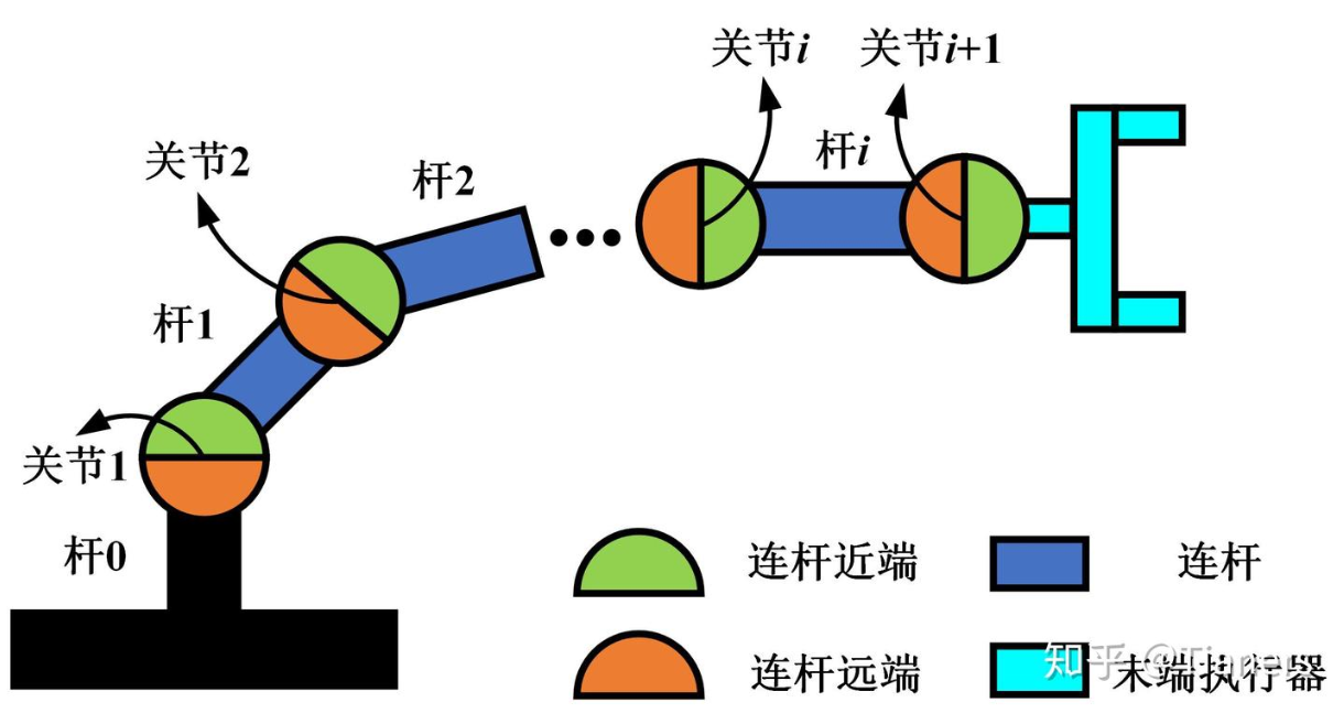 关节编号:杆i 离基座近的一端(近端)的关节为关节i,远的一端(远端)为关节i+1。
