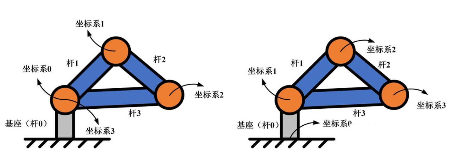 我们知道一个连杆有两端,一端离基座近,一端离基座远。简单的来说,标准DH将坐标系i建立在连杆i离基座近的一端,改进DH建立在离基座远的一端。