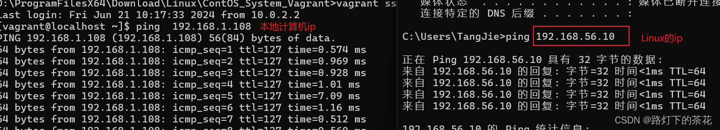 Windows下打开cmd进行ping Linux修改之后的ip,通过Linux也ping Windows的本地ip,如图所示: