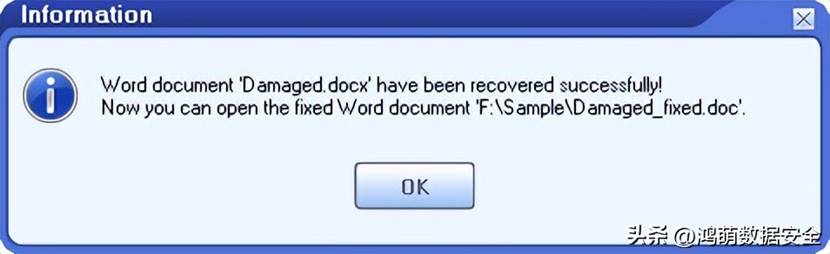 文件恢复过程结束后,如果源 Word 文件能够成功修复,用户将看到如下提示框: