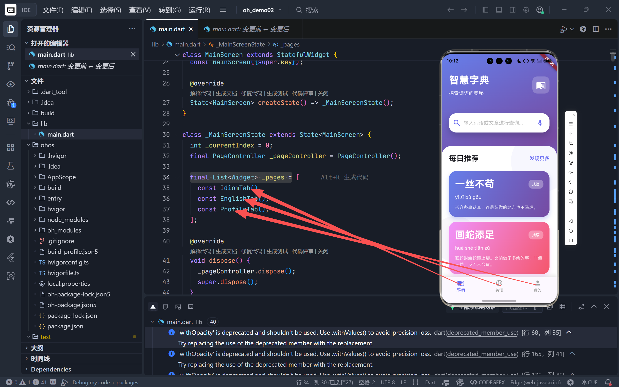 _pages列表 : 一个纯粹的 页面容器 。它将各个功能模块 (IdiomTab,EnglishTab,ProfileTab) 实例化并集中管理。要新增一个功能,只需在此列表中添加一项。- 独立的 Tab 组件 (