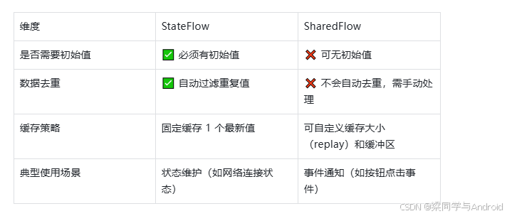 强状态绑定:是 SharedFlow 的特殊实现,专门用于持有和维护单一"当前状态值",本质等价于 SharedFlow(replay = 1, extraBufferCapacity = 0) 并自动过滤重复值。