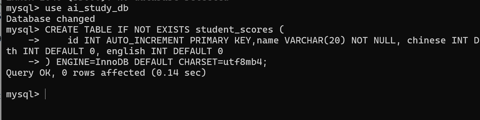 -- 创建名为ai_study_db的数据库(字符集utf8mb4,支持中文,小白固定写法)