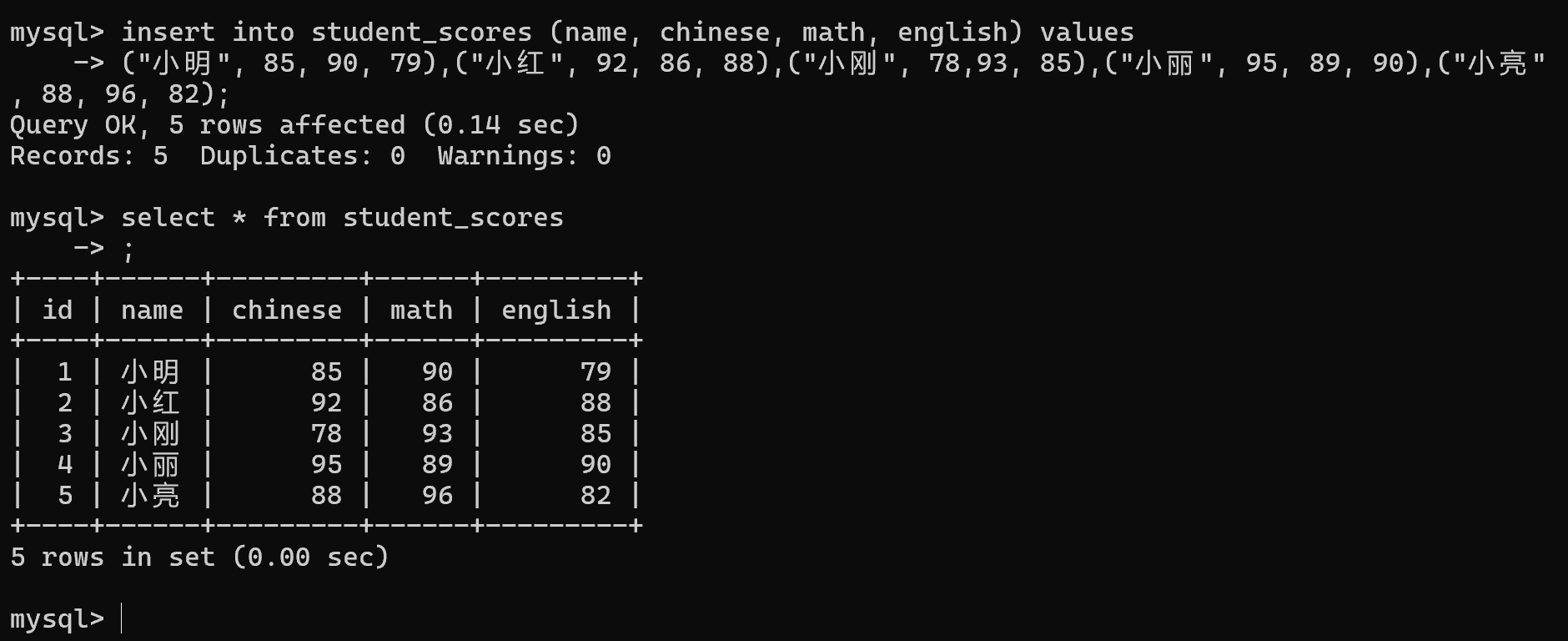 - 运行结果:显示「Query OK, 5 rows affected」,说明数据插入成功,也可手动查询一下。