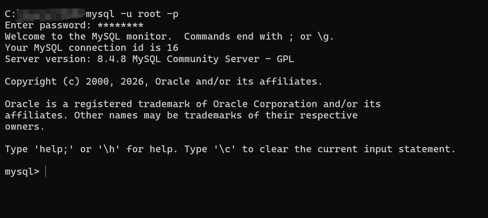 mysql>提示符,说明已成功登录 MySQL,可开始执行 SQL 语句。