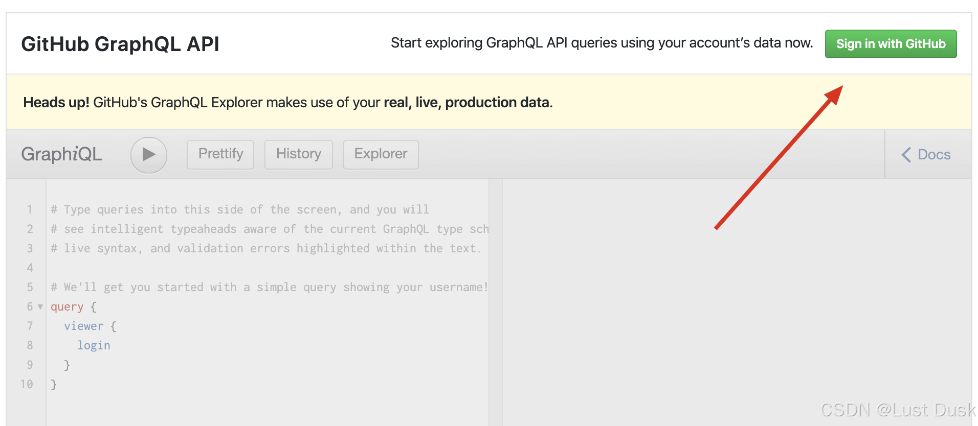 1.访问GitHub GraphQL API Explorer 的官方访问地址,进入工具界面。