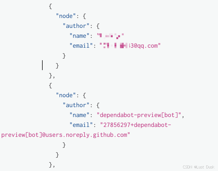 2.GitHub 平台自动生成邮箱:形如 "27856297+dependabot-preview [bot]@users.noreply.github.com" 的邮箱,此类邮箱是用户通过 GitHub 网页端或 API 进行提交操作时,平台自动生成的匿名化邮箱,不具备直接联系的作用。