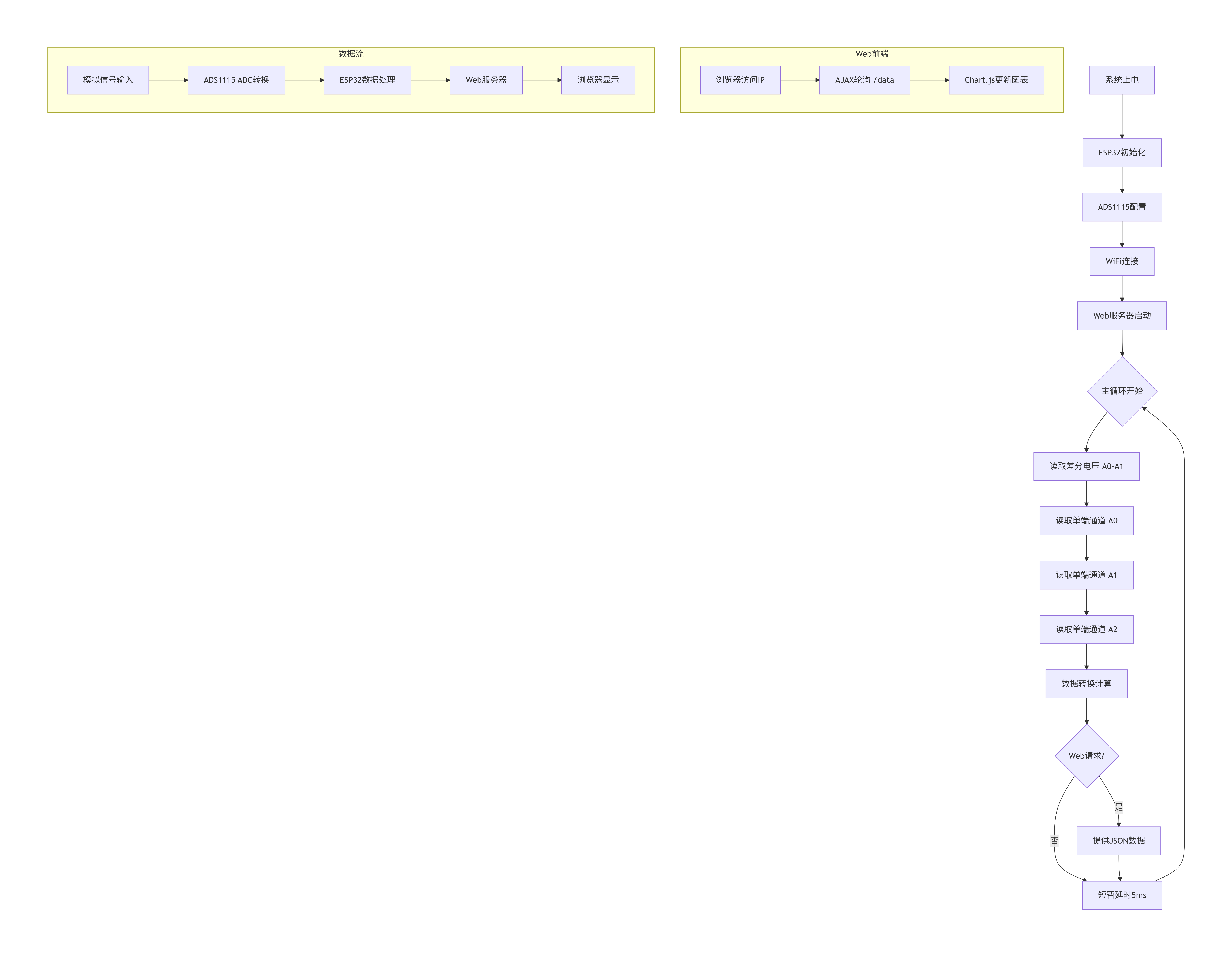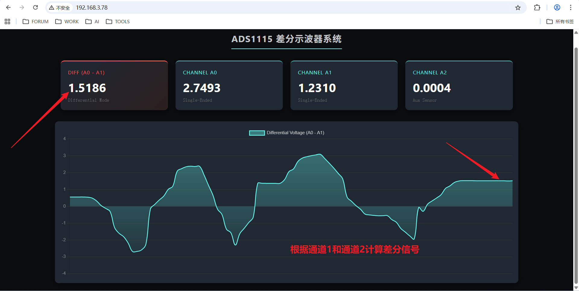 完整演示 ESP32 驱动 ADS1115 的多通道单端 / 差分采集流程,包含代码烧录、代码修改、WiFi 连接、Web 可视化全流程,直观展示差分电压随输入信号变化的实时波形,以及各通道电压的高精度显示效果