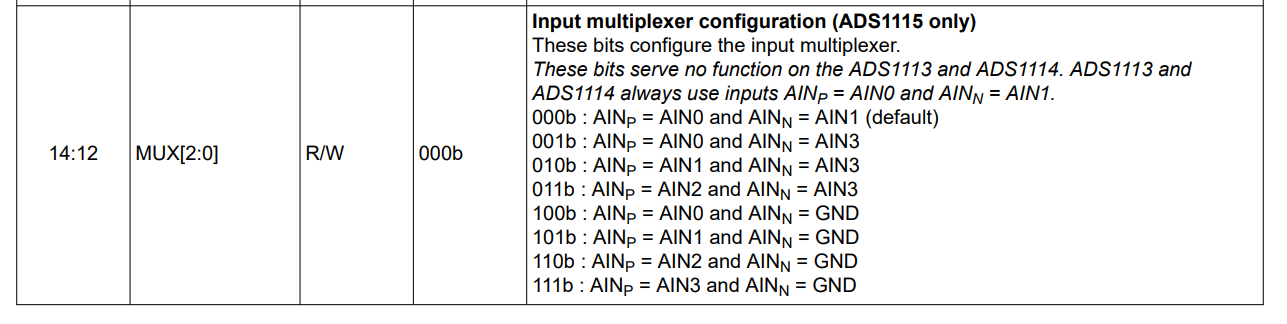 ADS1115包含两个差分输入,AIN0和AIN1可以与AIN3进行差分测量,多路复用器由配置寄存器中的位MUX [2:0]配置