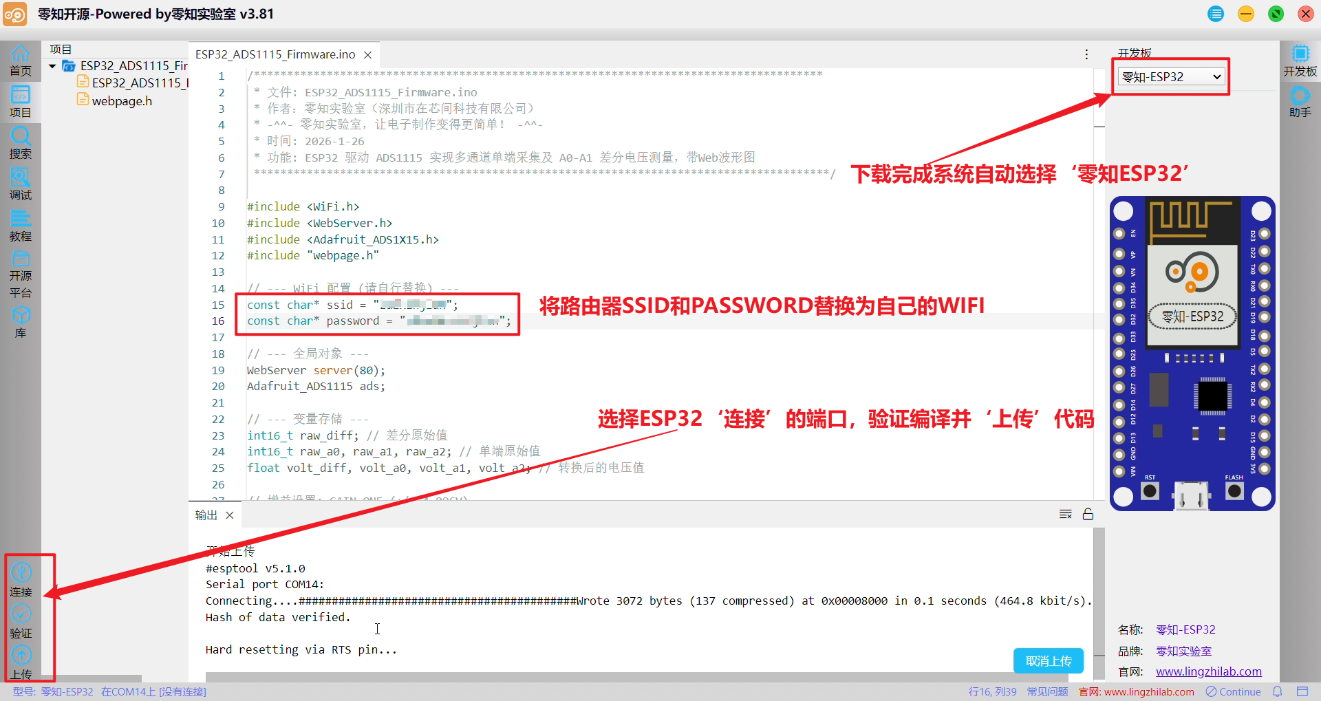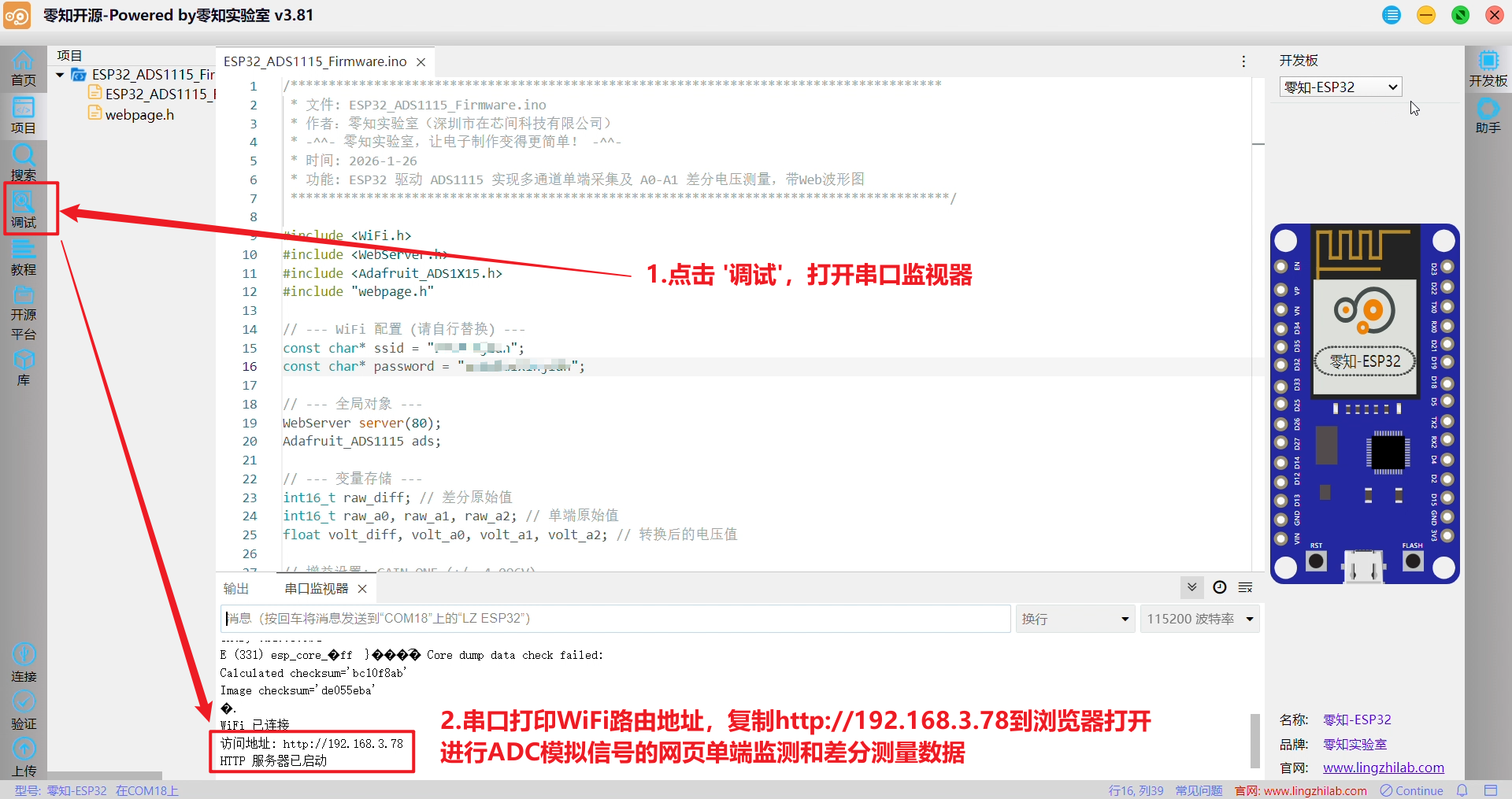 按照接线方案表完成 ESP32 与 ADS1115 的连接,A0/A1 接电位器(模拟差分信号),A2 接备用传感器,修改主程序SSID和PASSWORD为实际 WiFi 路由信息