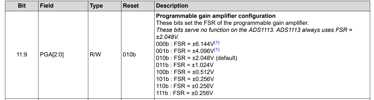 差分量程与增益配置一致(GAIN_ONE 对应 ±4.096V),即 A0-A1 的电位差范围为 - 4.096V~+4.096V
