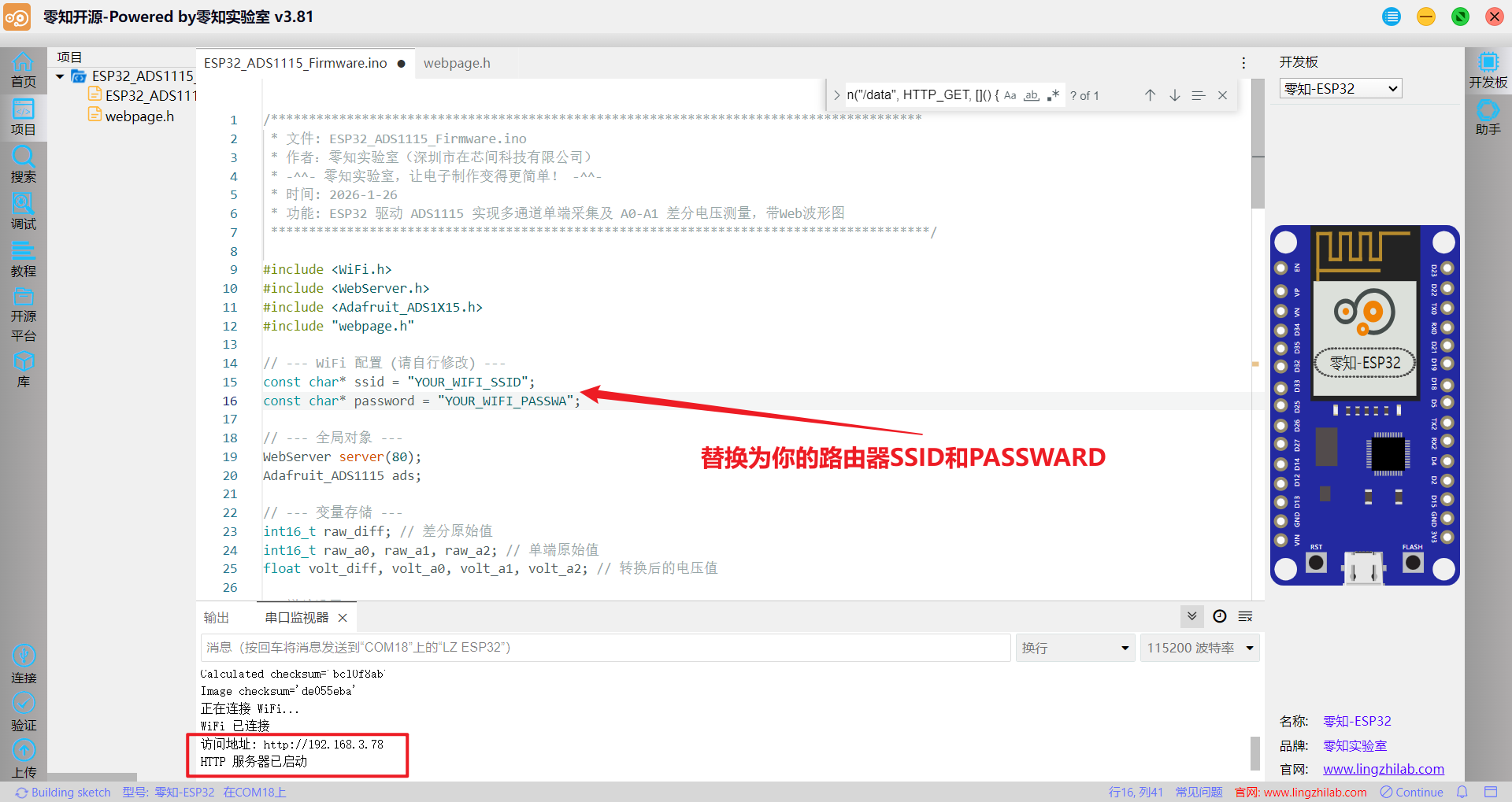 主程序文件,实现 WiFi 连接、ADS1115 数据采集、WebServer 搭建;头文件,存储 Web 页面的 HTML/CSS/JavaScript 代码