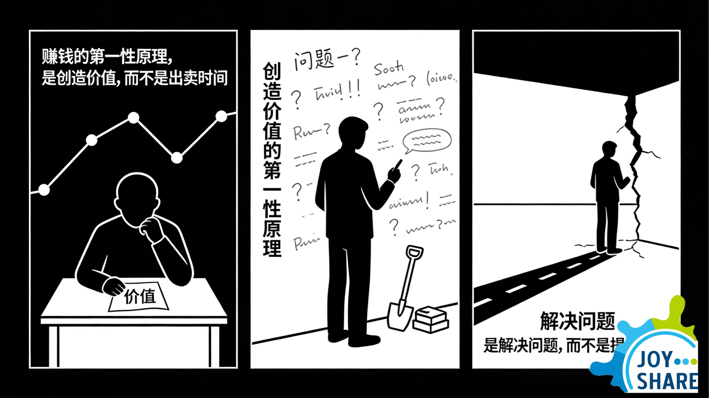 赚钱的第一性原理,是创造价值,而不是出卖时间。创造价值的第一性原理,是解决问题,而不是提供劳动。