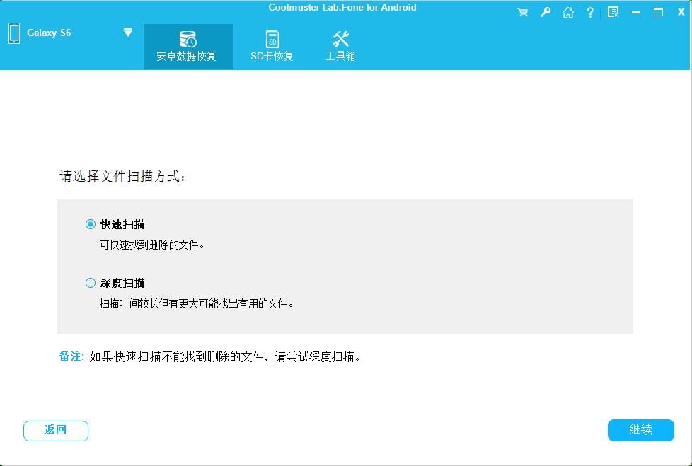 03选择"快速扫描"或"深度扫描"模式,然后单击继续开始扫描Android手机上的数据。