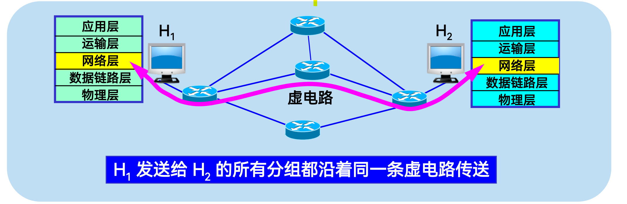 虚电路服务 :模仿电信网络的面向连接模式,通信前需建立逻辑连接(虚电路VC),网络会预留资源并保证分组按序、无差错交付。所有分组沿同一条虚电路传输,仅在连接建立阶段使用完整终点地址,后续分组使用短虚电路号。但这种模式需网络承担可靠传输责任,导致网络层设计复杂,灵活性不足。