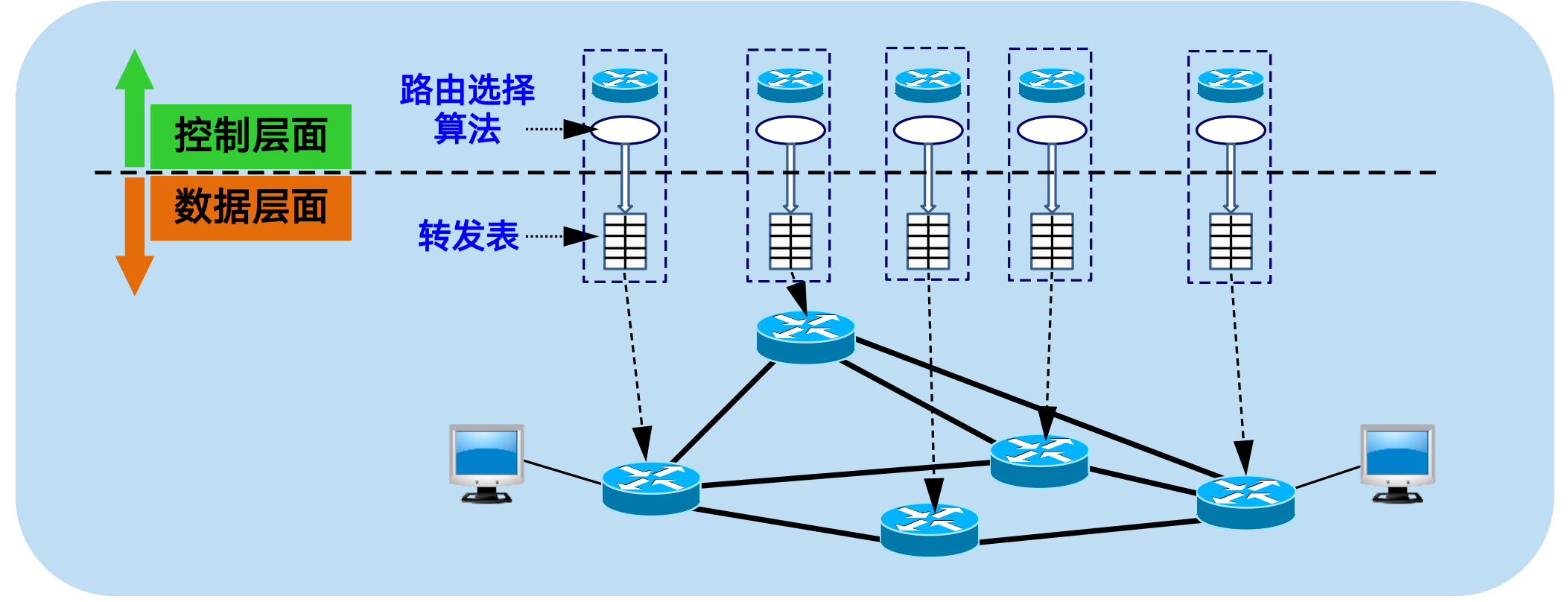 数据层面:路由器基于本地转发表,将收到的分组从对应接口转发出去,采用硬件实现,转发速度快且独立工作,不依赖其他路由器。