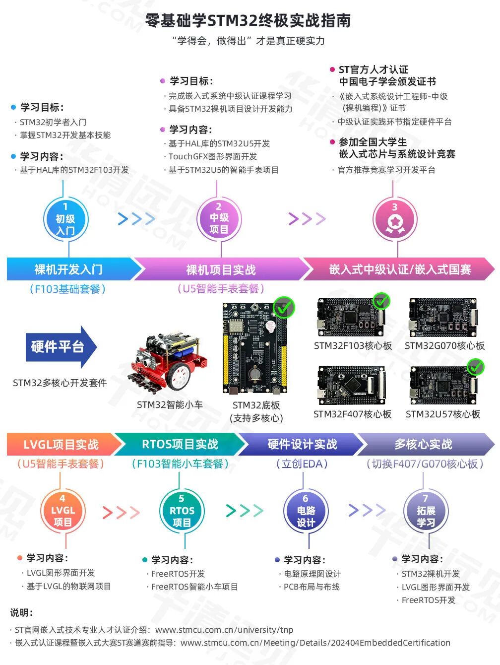 我们是建议从103入门,然后切换到U5智能手表项目实战,再到RTOS智能车项目实战,这样子把裸机开发/项目+LVGL/TouchGFX图形界面开发项目+RTOS开发/项目都体系化的学习下来。这个板子,有参赛、考证、教学、毕设项目、学习STM32需求的用户,可以多多关注。