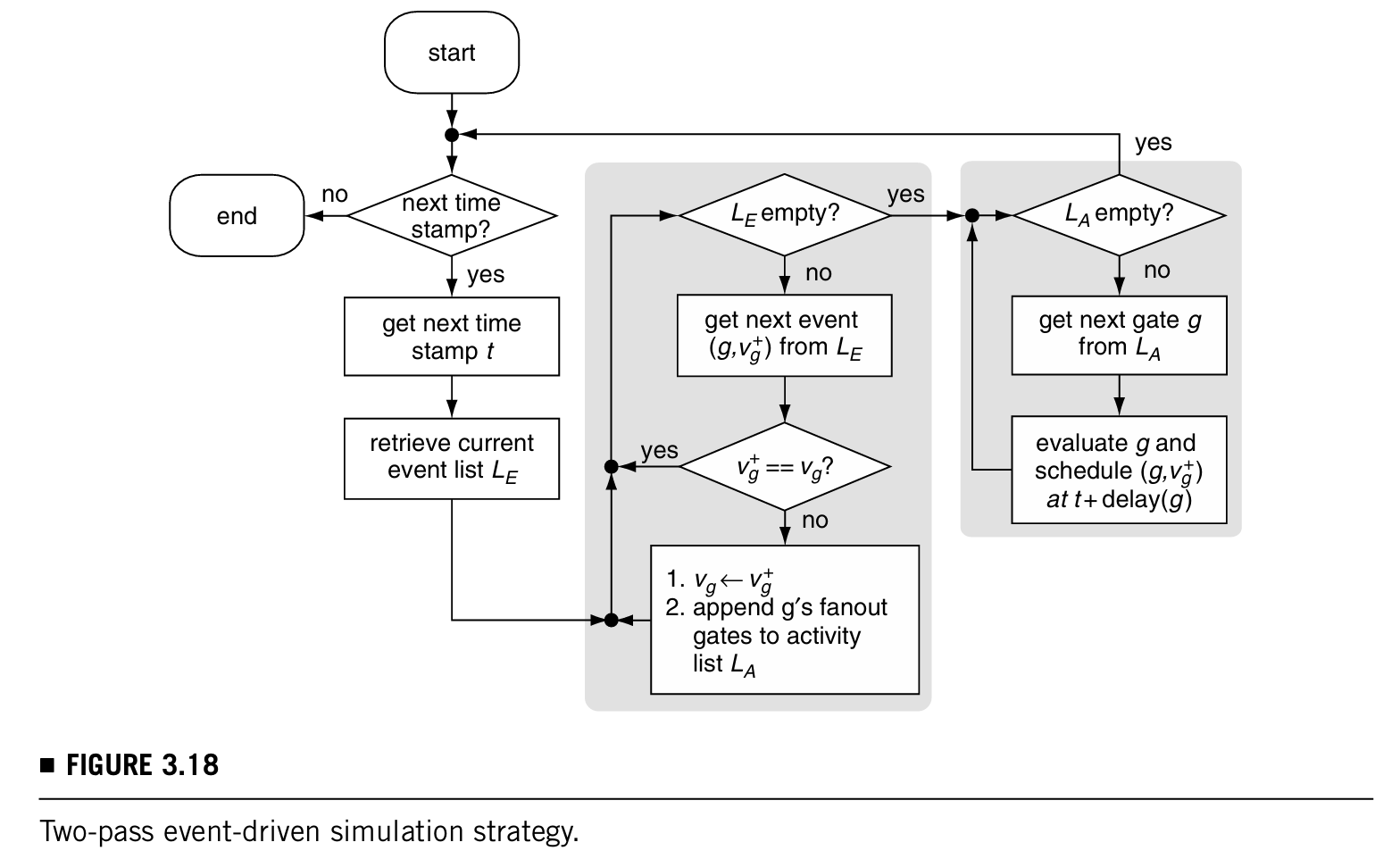 下图描述了zero-delay event-driven simulation 的flow(zero-delay指的是门和互连线都没有延迟):