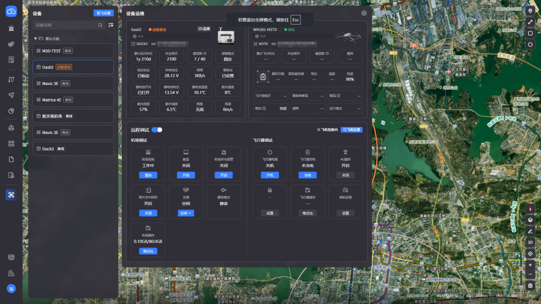 设备 运维保障 升级 : 新增固件升级、存储格式化、空调模式调整、飞机在舱状态展示、强制关舱等功能,支持查询无人机最后位置并导航。
