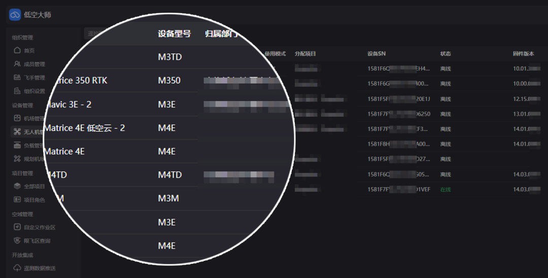 组织项目 管控精细化 : 推出组织级管理后台,支持多项目创建,实现数据隔离与设备共享;细化人员权限管理,支持自定义项目角色及操作权限;新增飞手管理模块,关联飞行执照信息,满足合规要求。