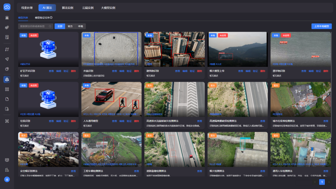 AI算法**** 体系拓展,适配性增强 : 提供了自有算法上传通道与标准化验证流程,用户可上传本地已有算法模型;针对行业专用需求,支持第三方算法云端接入,快速集成行业算法模型;支持多模态大模型调用和提示词编辑,强化复杂场景的语义理解能力,提升准确率。