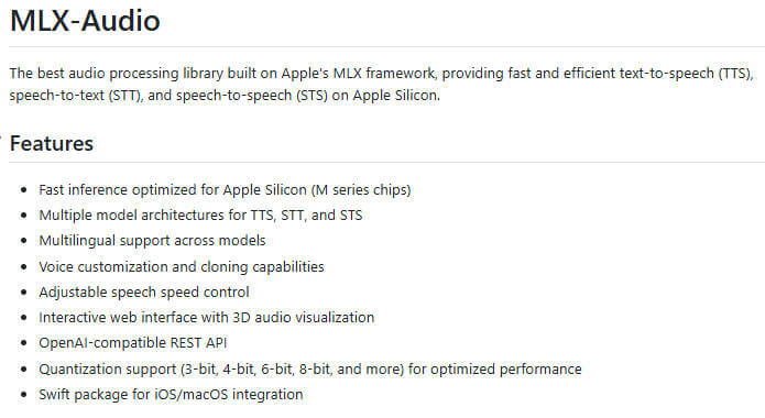 | 📝 核心功能 | 基于 Apple MLX 框架的全功能语音处理库,支持文本转语音(TTS)、语音转文本(STT)、语音转语音(STS); 针对 Apple Silicon 芯片深度优化,推理高效且资源占用低,适配 macOS 与 iOS 平台; Python 接口简洁易用,可快速集成到语音交互、音频处理等应用,支持自定义语音参数。 | |